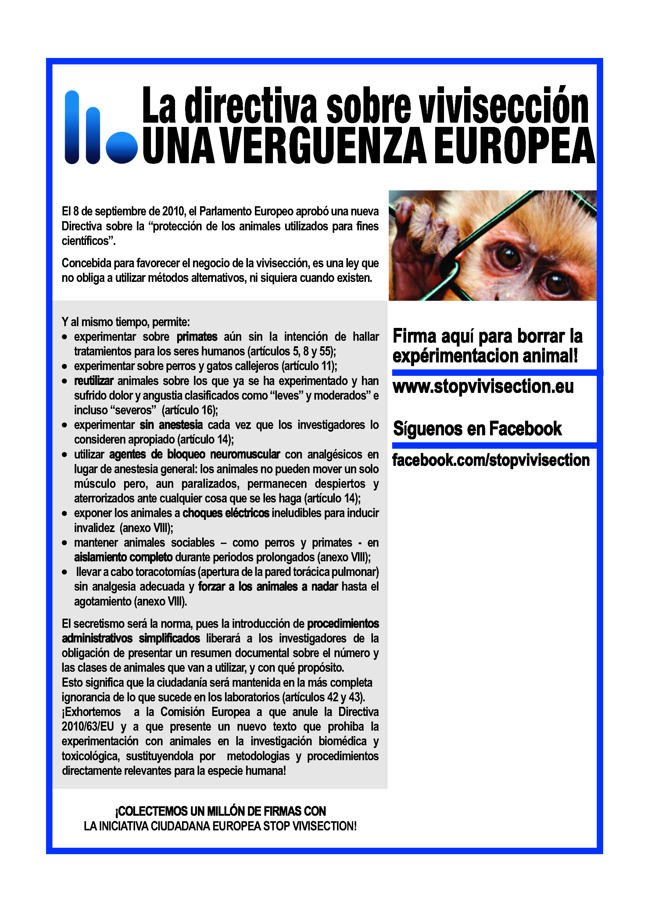 Exhortamos a la Comisión Europea a que anule la Directiva 2010/63/UE relativa a la protección de los animales utilizados para fines científicos y a que presente un nuevo texto que prohíba la experimentación con animales en el campo de la investigación biomédica y toxicológica, sustituyéndola por metodologías y procedimientos válidos para el ser humano.
