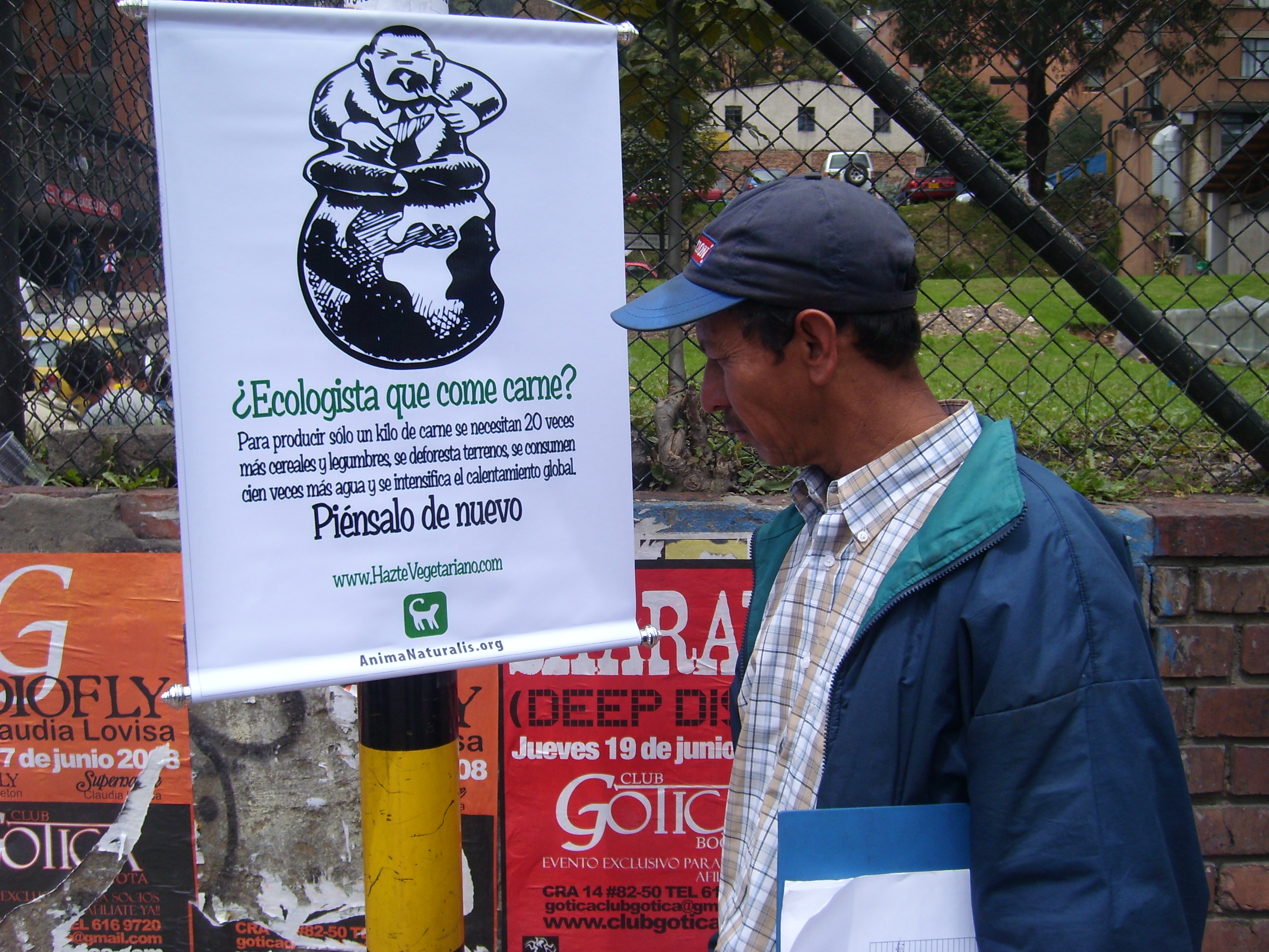 Desde las 12 del día activistas de AnimaNaturalis repartieron volantes a los transeuntes de la carrera séptima entre calles 41 y 45, frente a la Universidad Javeriana. El material impreso explicaba la manera en que el medio ambiente se ve afectado con el consumo de carne en el mundo.