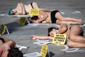 La organización por la defensa de los animales AnimaNaturalis y CAS han organizado un acto de protesta de alto impacto en Zaragoza el último día de las fiestas del Pilar. Los más de 40 participantes se han puesto en la piel de los toros que han muerto durante estos días y con sus cuerpos semidesnudos han representado “la escena de un crimen”.