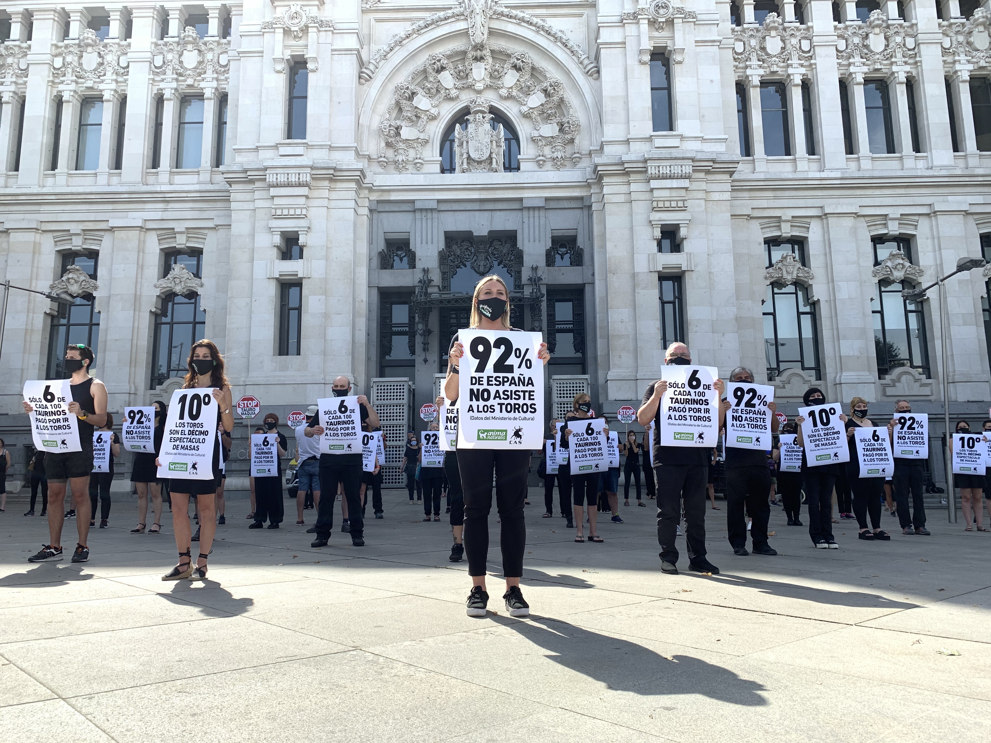 Ataviados con ropas y mascarillas de color negro con la frase "Yo defiendo a los animales", los participantes en la protesta se han colocado delante del Ayuntamiento de Madrid, en la Plaza de Cibeles, donde han desplegado pancartas y han guardando la preceptiva distancia de seguridad.