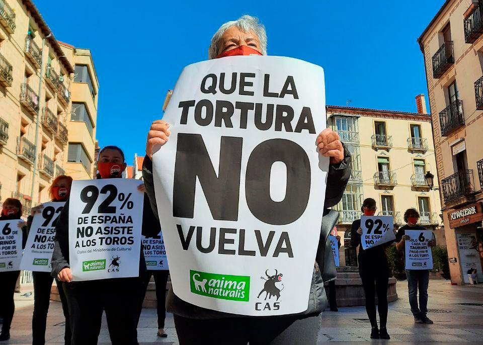 AnimaNaturalis, junto a CAS Internacional, ha organizado la primera protesta antitaurina del año en Soria, para pedir que las corridas de toros "no regresen jamás", después de que la pandemia haya impedido su celebración este año. "Durante la cuarentena, se han cancelado la mayoría de las ferias del país, y el sector taurino (que ya subsistía, en gran medida, gracias al dinero público), exige nuevas dotaciones presupuestarias para mantenerse a flote un negocio cruel y anacrónico, abocado a la quiebra", asegura Anima Naturalis.