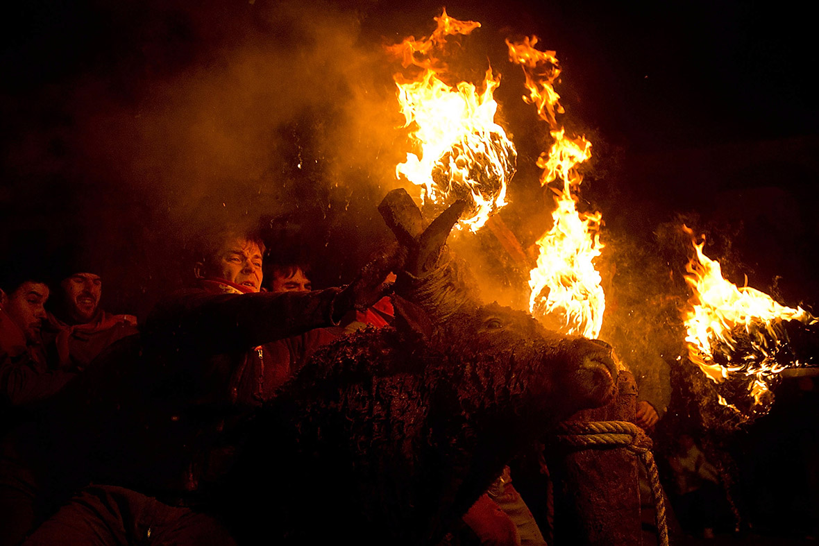 Imagine a score of people surrounding and grabbing a bull tied with a rope by the head. They hold it so tightly that it is immobilized against a log to set fire to the archaic structure attached to its horns. They will harass him for an hour, while the bull tries to flee from the huge embers that burn just above his head.