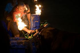 Y sacar a un animal del campo y meterlo en un camión, dejarlo durante horas metido en un cajón, soltarlo ante una turba de personas, la mayoría hombres, con ganas de emoción y adrenalina, con mucho alcohol en la sangre, gritos, tirones derabo, patadas, lanzamientos de objetos, de arena, provocaciones,... por no hablar de cuando se le amarra la cabeza con cuerdas para someterlo a la voluntad de los participantes. En el bou en corda, si el toro embiste, frenazo en seco. Si se queda quieto por agotamiento o colapsado por el miedo, es tironeado y en ocasiones casi arrastrado por las calles. En el ‘bou embolat’, inmovilizado mediante la fuerza bruta de 20 hombres sin más aspiración en la vida que la de demostrar que son capaces de someter a un animal asustado.