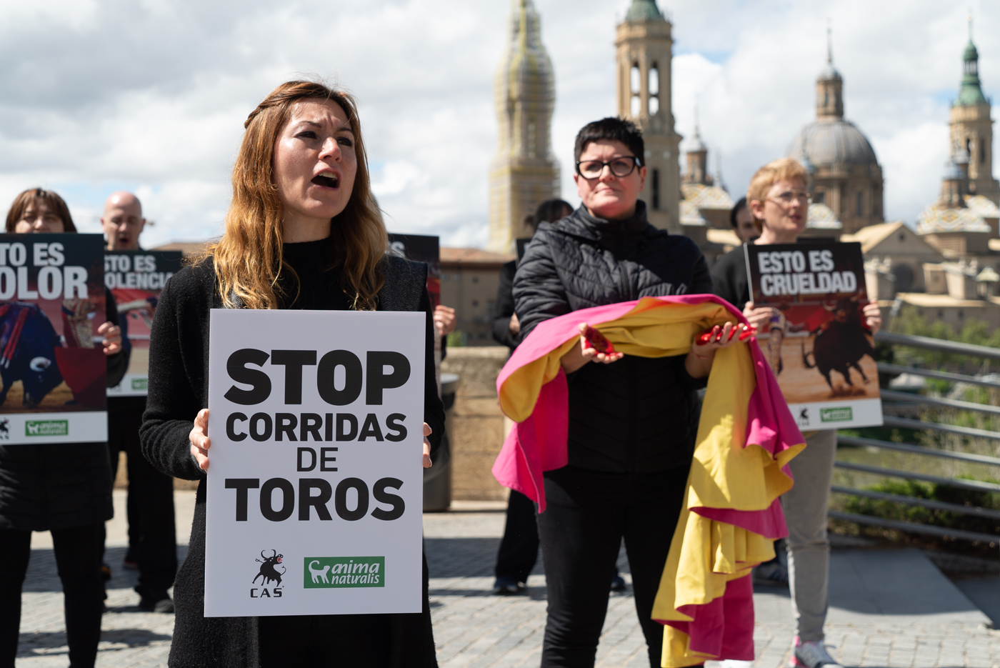 Con la estampa de la Basílica del Pilar de fondo, Zaragoza se convirtió ayer en el epicentro de una protesta histórica. Activistas de AnimaNaturalis y CAS International alzaron sus voces frente al Balcón de San Lázaro para exigir el fin de las corridas de toros durante la Feria de San Jorge. Bajo el lema “Tauromaquia no es mi Cultura”, los activistas denunciaron el respaldo institucional a una tradición que, aseguran, “violenta los derechos de los animales y desoye el sentir ciudadano”.