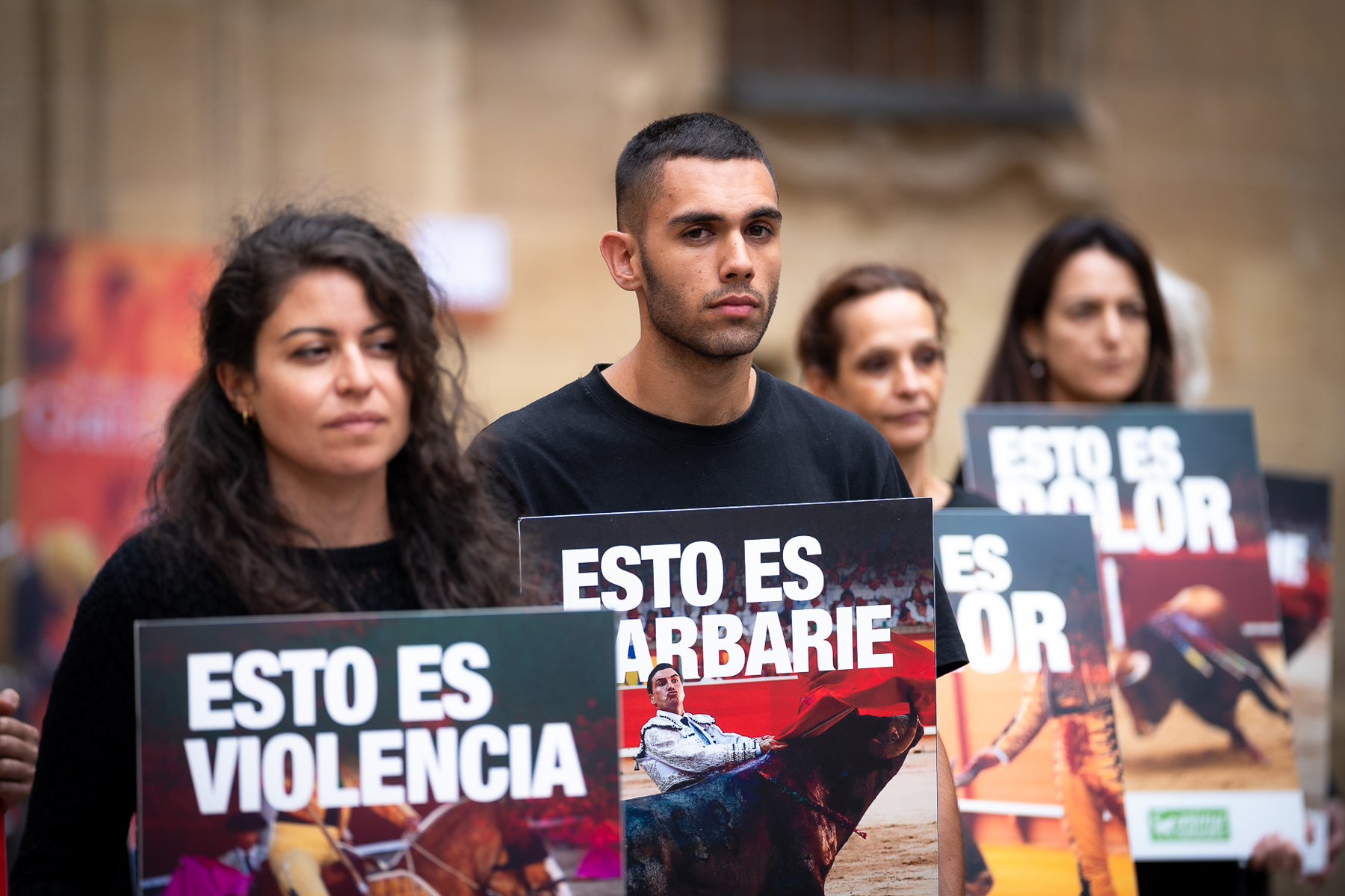 The elements of the protest were meticulously chosen to maximize emotional impact. Participants, dressed entirely in black as a sign of mourning for the animals, held banners with concise and direct messages designed to confront passersby with the stark reality of bullfighting. Phrases like "This is pain", "This is cruelty", "This is violence", and "This is barbarism" were designed to strip bullfighting of its cultural romanticism and expose it as an act of brutality. The demonstration transformed into a form of street theater, with activists using bullfighters' capes and red paint to simulate the blood and suffering that animals endure in the ring. This dramatization was not merely a representation, but a deliberate effort to force citizens to see the pain that the bullfighting industry tries to disguise.