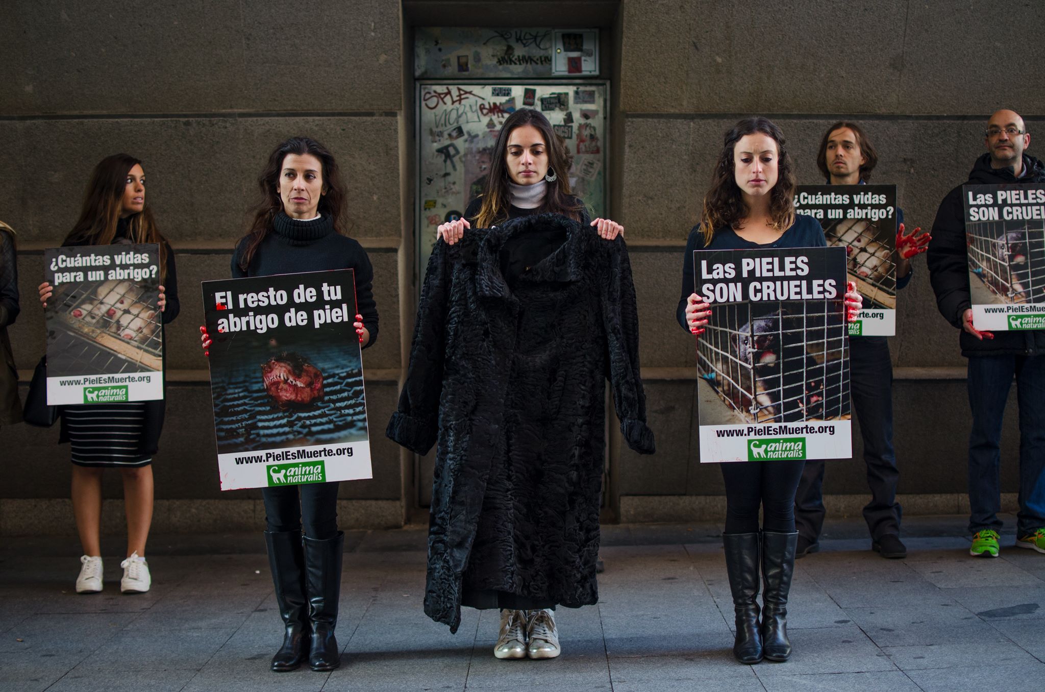 El pasado 19 de noviembre realizamos una protesta en contra del uso de pieles de animales en prendas de vestir. Se hizo frente al Corte Inglés de la calle Preciados de Madrid, lugar donde aún hoy en día se siguen vendiendo gran cantidad de atuendos usando la piel de animales vivos; la piel más demandada es la de: los zorros, visones, chinchillas, mapaches, castores, nutrias y otros animales a los cuales se les arranca cruelmente su piel creándoles un alto grado de dolor. Por esta simple y brutal razón quise participar en esta acción.