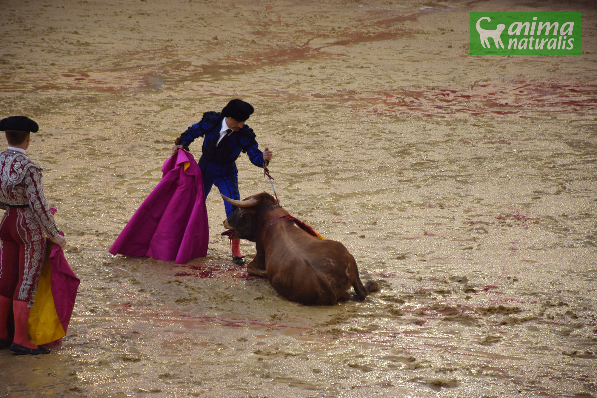 Salia el primer novillo, las condiciones no podian ser peores, los propios acomodadores comentaban que era una vergüenza que por no devolver el dinero se siguiera adelante, la arena se iba encharcando mientras iba lloviendo con mas y mas fuerza, el animal inocente, aterrorizado no paraba de resbalar e intentar buscar una salida, ante esto yo no podía sentir otra cosa que no fuera impotencia, debido a la lluvia me era imposible tomar imágenes por mucho que lo intentara. Después de que mataran al primer novillo, estuve a punto de salir de la plaza, en ese momento pensé ‘han confiando en ti para esto, no puedes rendirte con tanta facilidad’, por lo que decidí seguir intentándolo, con una bolsa de plástico conseguí proteger un poco la cámara, y empecé a sacar todas las imágenes que pude, cada imagen que tomaba mostraba crueldad y sufrimiento, el momento que más me impactó fue tras la muerte del segundo novillo, al sacar su cuerpo dejaba un gran rastro de sangre en la arena, la misma pregunta que nos hacemos todos los días pasaba por mi cabeza ‘¿cómo puede alguien disfrutar viendo esto?’. Nunca obtendremos una respuesta coherente.