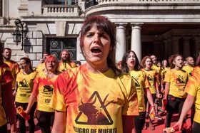 Un polvo rojo fue el protagonista la mañana del 10 de Marzo en la Plaza del Ayuntamiento de Valencia. El polvo rojo sangre que bañó la calle, y los rostros y cuerpos de los 100 activistas que nos reunimos allí, en una acción protesta en memoria de todos los toros que serán asesinados en las conocidas Fallas valencianas.