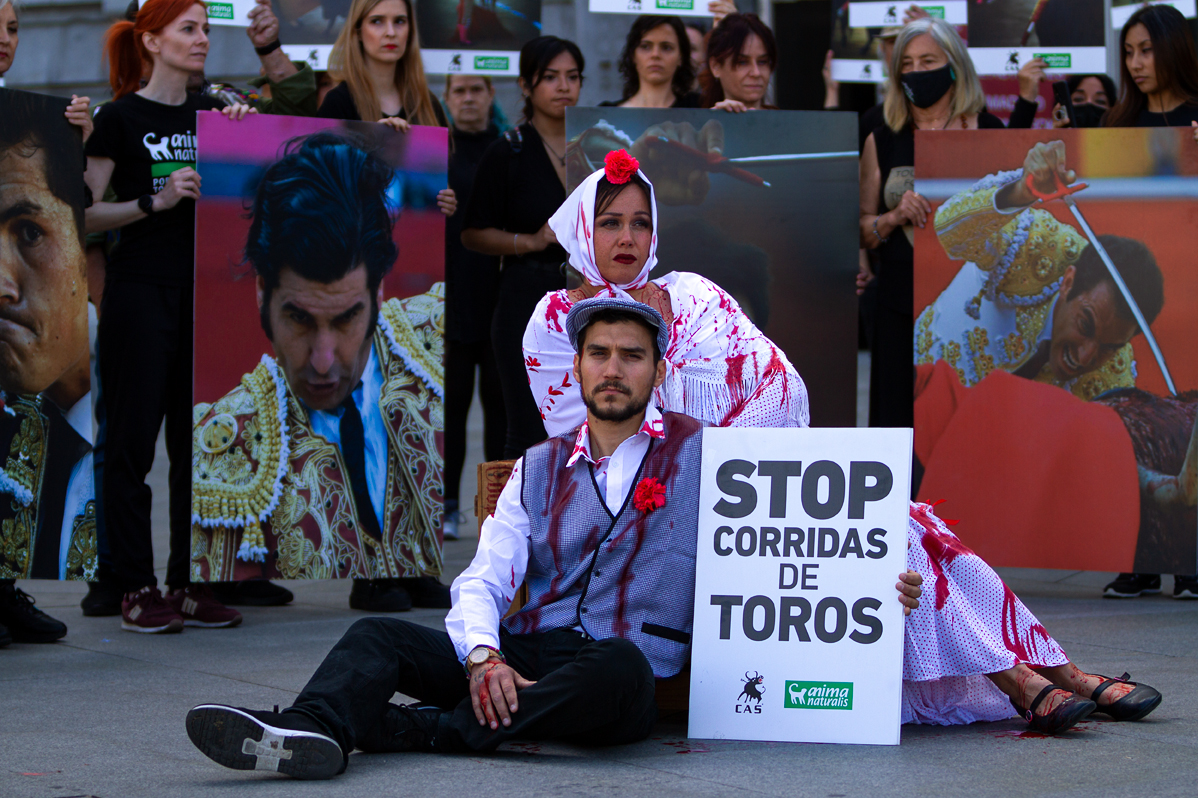 Activistas de AnimaNaturalis y CAS International mostraron el pasado domingo 8 de mayo el verdadero rostro de la tauromaquia en plenas fiestas de San Isidro. Más de medio centenar de activistas se dieron cita en el Palacio de Cibeles en Madrid para protestar por la feria taurina que se celebra durante San Isidro. Los personas que participaron de la protesta levantaron grandes pancartas con los rostros desencajados de toreros en el instante de dar muerte al toro, rodeando a una pareja de chulapo y chulapa como un símbolo de víctimas de la tauromaquia.
