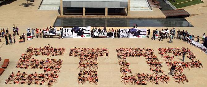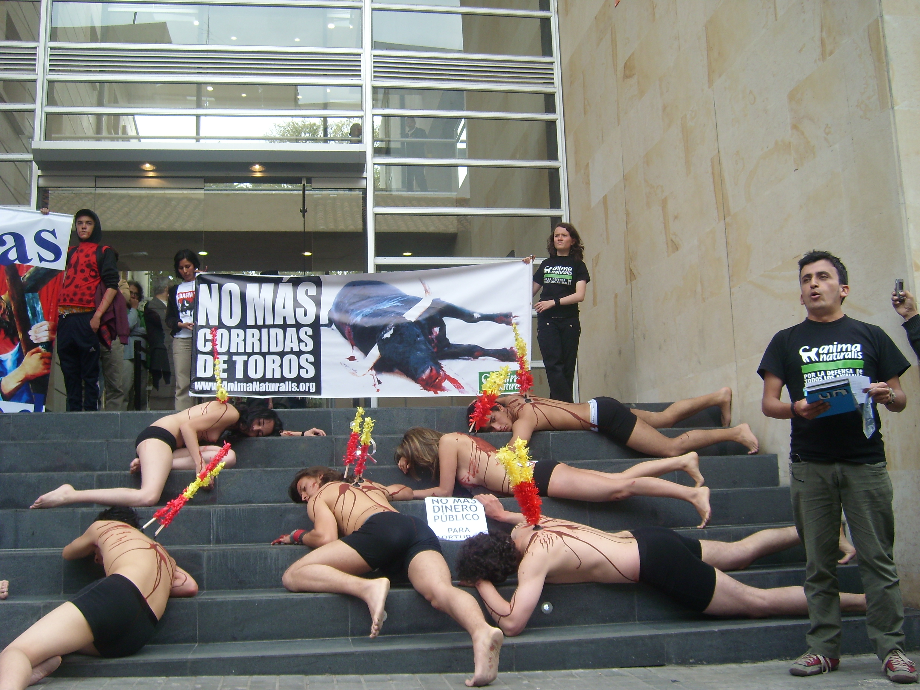 Desde la una de la tarde activistas ensangrentados y con banderillas clavadas en la espalda, protestaron por las corridas de toros organizadas por la Alcaldía en el marco del Festival de Verano.