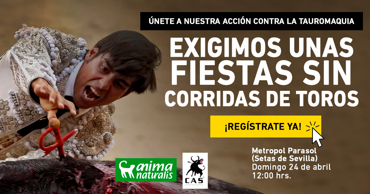 AnimaNaturalis junto a Cas International, realizamos una impactante protesta para exigir una Feria de Abril sin crueldad ni tortura de animales el domingo 24 de abril en Sevilla. ¡Te esperamos!