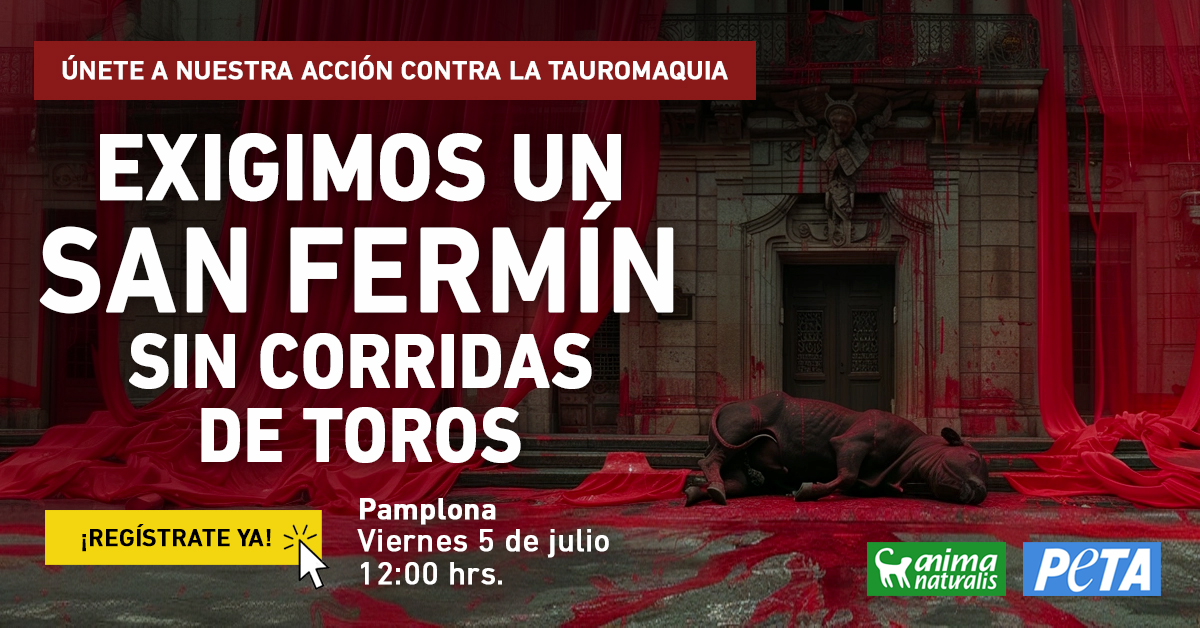 Por eso mismo, próximo viernes 5 de julio, tan sólo dos días antes de que comience el primer encierro de San Fermín, AnimaNaturalis y PETA realizaremos una gran protesta contra las corridas de toros en Pamplona que no dejará indiferente a nadie. Quedaremos a las 10:30 en Los Corralillos del Gas para prepararnos. La acción comenzará puntual a las 12:00 hrs frente al Ayuntamiento.