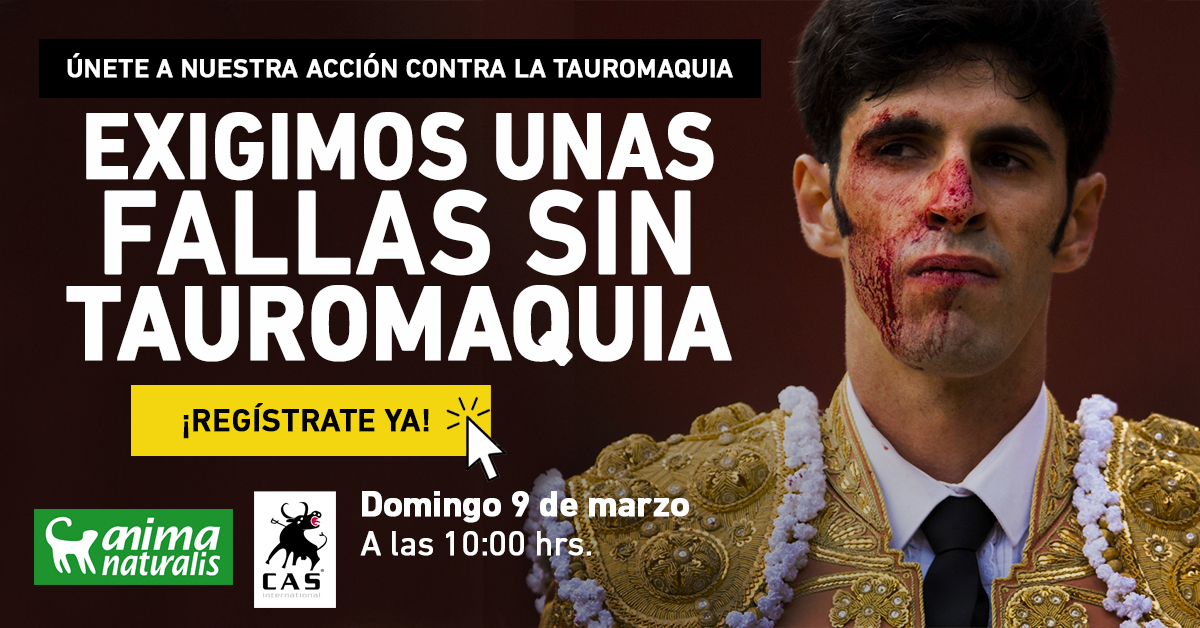 Únete a la acción antitaurina de AnimaNaturalis y CAS International. Con una protesta impactante, mostraremos que la ciudadanía valenciana se avergüenza de que las fallas queden empañadas, cada año, por la feria taurina.