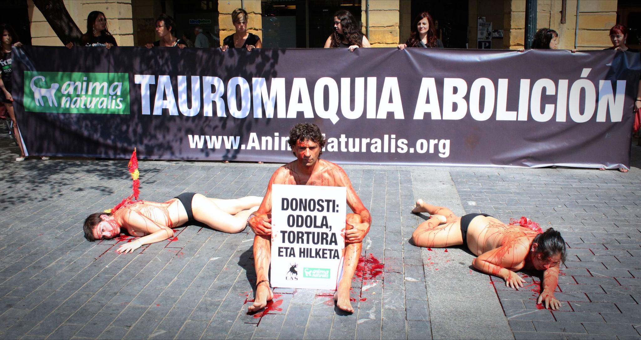 Activistas de AnimaNaturalis simularon en Donostia el pasado domingo 12 de agosto de una manera impactante, ser tres toros torturados en las 'fiestas' taurinas para mostrar el rechazo a dicha actividad, y exigir al Gobierno Local que sea éste el último año que tengan lugar.