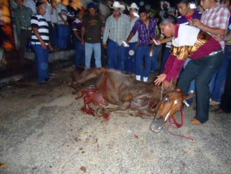 Esta actividad, además del maltrato inherente que se le infringe a los toros, tiene como principal atracción el asesinato de caballos usando toros criados y entrenados para que los ataquen directamente a ellos, resultando en lesiones mortales que dejan expuestos sus intestinos y que causan altísimos niveles de dolor para los caballos.
