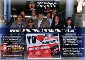 El pasado 29 de octubre, el Alcalde de Surquillo, José Luis Huamaní y el Consejo Municipal del Distrito de Surquillo aprobaron por unanimidad la ordenanza que declara la prohibición de corridas de toros, peleas de canes y peleas de gallos.