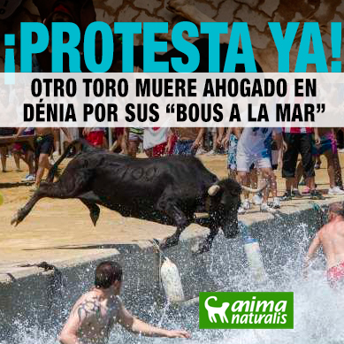 Tal como ya ocurrió en 2012, Este año otro toro ha muerto ahogado en Dénia, en la festividad anual de “bous a la mar”. En esta tradición, los mozos del pueblo persiguen y arrojan a los toros a la bahía, y nunca ha estado exento de accidentes. El toro cayó al agua enredado en las ropas de lo que la prensa a calificado como “un chico corpulento”. Aunque los organizadores siguen insistiendo que no existe maltrato animal o sufrimiento de ningún tipo para los toros, este tipo de situaciones se están repitiendo continuamente en los últimos años.