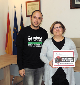 ''Estamos muy satisfechos, la campaña avanza imparable y con Sant Joan hemos conseguido que dieciséis municipios de la isla se declaren antitaurinos. Este es un paso más en nuestro objetivo para que Mallorca se declare antitaurina en su totalidad. Quizás la temporada taurina de este año, sea la última en tierras mallorquinas", declara Guillermo Amengual, coordinador de la campaña Mallorca Sense Sang, que entregó un reconocimiento a la alcaldesa de Sant Joan, Catalina Gayà, agradeciendo así la presentación de la moción antitaurina.