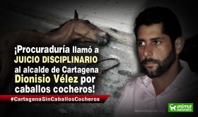 Bogotá D.C., Colombia - AnimaNaturalis celebra que la Procuraduría General de la Nación llame a juicio disciplinario al alcalde de Cartagena Dionisio Vélez, por el maltrato a los caballos cocheros. Esto se da semanas después de que el Grupo de Acciones Públicas de la Universidad Javeriana, abogados independientes y AnimaNaturalis Internacional radicaran una acción popular ante el Tribunal Administrativo de Cundinamarca.