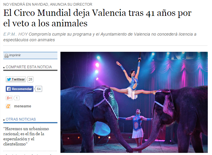 Sin embargo, la voz discrepante ha llegado de uno de los circos más antiguos y con más solera de la ciudad: el Gran Circo Mundial, con presencia activa en Valencia desde 1973, es decir, 41 años de actuaciones navideñas ininterrumpidas. Desde Laredo (Cantabria), donde han acampado sus carpas y caravanas (tienen actuaciones del 24 al 29 de julio), el fundador, propietario y director José María González ha aseverado que no volverán a Valencia, porque no pueden prescindir de los animales. "En Europa la columna vertebral del circo la componen los payasos, los acróbatas y los animales", ha sentenciado.