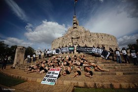 Durante 30 minutos, la vocera de AnimaNaturalis para el sureste de México, Stephanie Munguía Castillón, y los integrantes de la valla humana que rodeaba a los “banderillados” alzaron sus voces a favor de la abolición de la tauromaquia e informaron a los espectadores y medios de comunicación presentes acerca de lo que se ha logrado en esta materia a nivel nacional.