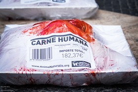 El pasado domingo 22 de mayo, veinte activistas de AnimaNaturalis desnudos y ensangrentados dentro de bandejas plastificadas, representaron los envases de carne animal que tan acostumbrados estamos a ver en tiendas y supermercados. El objetivo de la acción era la concienciación de la ciudadanía de los beneficios de una dieta libre de carne y, por lo tanto, libre de explotación, sufrimiento y muerte animal.
