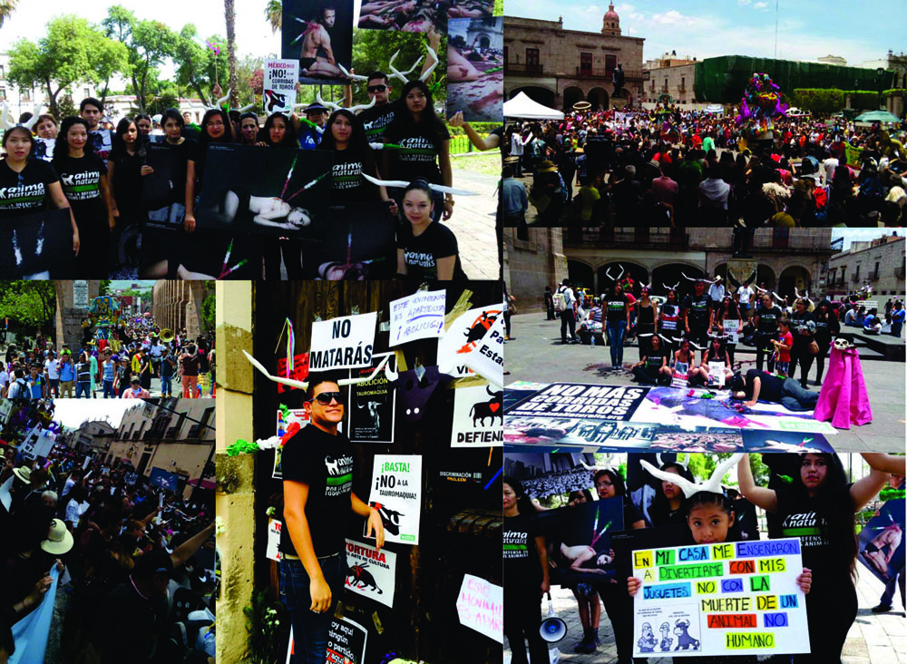 Representantes de más de 20 asociaciones animalistas de Michoacán, grupos artísticos, toritos de petate, deportistas y la ciudadanos en general marcharon por la Avenida Madero de Morelia, acompañados por una banda de música de viento que también lucía pancartas contra la tauromaquia.