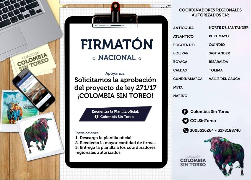 Colombia – La coalición Colombia Sin Toreo, a la cual AnimaNaturalis Internacional pertenece junto a numerosas entidades defensoras de los animales del país, promueve una gran recolecta de firmas a nivel nacional en apoyo al proyecto de ley 271 de 2017.