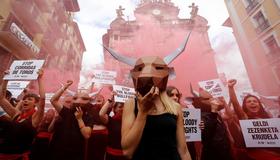La ya tradicional protesta contra la tauromaquia en la víspera del inicio de las fiestas San Fermín ha estado vigilada por la Policía y ha consistido en una concentración ante la plaza consistorial, donde los activistas han aparecido vestidos de negro y con el tradicional pañuelo y faja rojos sanfermineros, al ritmo de un tambor, en procesión por la Cuesta de Santo Domingo.