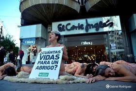 Activistas de la organización AnimaNaturalis se han concentrado el domingo 22 de diciembre en Valencia desnudos, con sangre artificial y amontonados unos sobre otros para reclamar que en España se legisle contra el uso de piel animal en la fabricación de prendas de vestir.