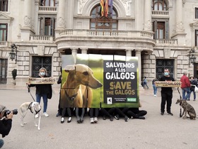 Por ello, realizamos un acto de protesta en la Puerta Del Ayuntamiento de Valencia para denunciar los más de 50.000 galgos que son abandonados cada año. Los activistas formaron un cartel de grandes dimensiones para denunciar el trato al que se les somete a los galgos en diversas regiones de España.