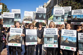 Un centenar de personas se reunieron frente al antiguo edificio de Correos de Valencia el pasado sábado para exigir protección igual ante la ley valenciana y la futura Ley estatal de protección animal, para los perros utilizados en actividades de caza, sean deportivas o cinegéticas. Realizaron una instalación que ilustra a las otras víctimas de la caza, que son los perros que explotan para esa actividad.