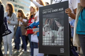 En toda la UE, alrededor de 300 millones de cerdos, gallinas, conejos, patos, codornices y gansos pasan la mayor parte de su vida cada año en jaulas. Las gallinas ponedoras y los conejos están confinados en jaulas estériles del tamaño de una hoja de papel A4. Las cerdas se ven obligadas a amamantar a sus lechones en jaulas tan pequeñas que ni siquiera pueden darse la vuelta. Se enjaulan patos y gansos para alimentarlos a la fuerza y producir foie gras.