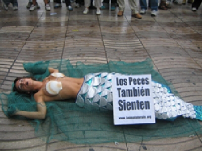Una activista de la organización AnimaNaturalis se ha disfrazado hoy de sirena y ha simulado que era atrapada por una red de pesca en medio de las Ramblas, para expresar su protesta por el sufrimiento que padecen los peces, tanto en la pesca industrial como en la deportiva.