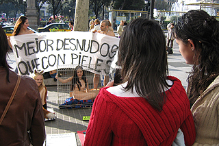 Bajo el lema "Mejor desnudos que con pieles", una joven se ha introducido en una jaula desnuda y otros dos han hecho "top less" para escenificar la tortura de animales, que también han mostrado mediante fotografías de ejemplares destrozados y mutilados en granjas de peletería.