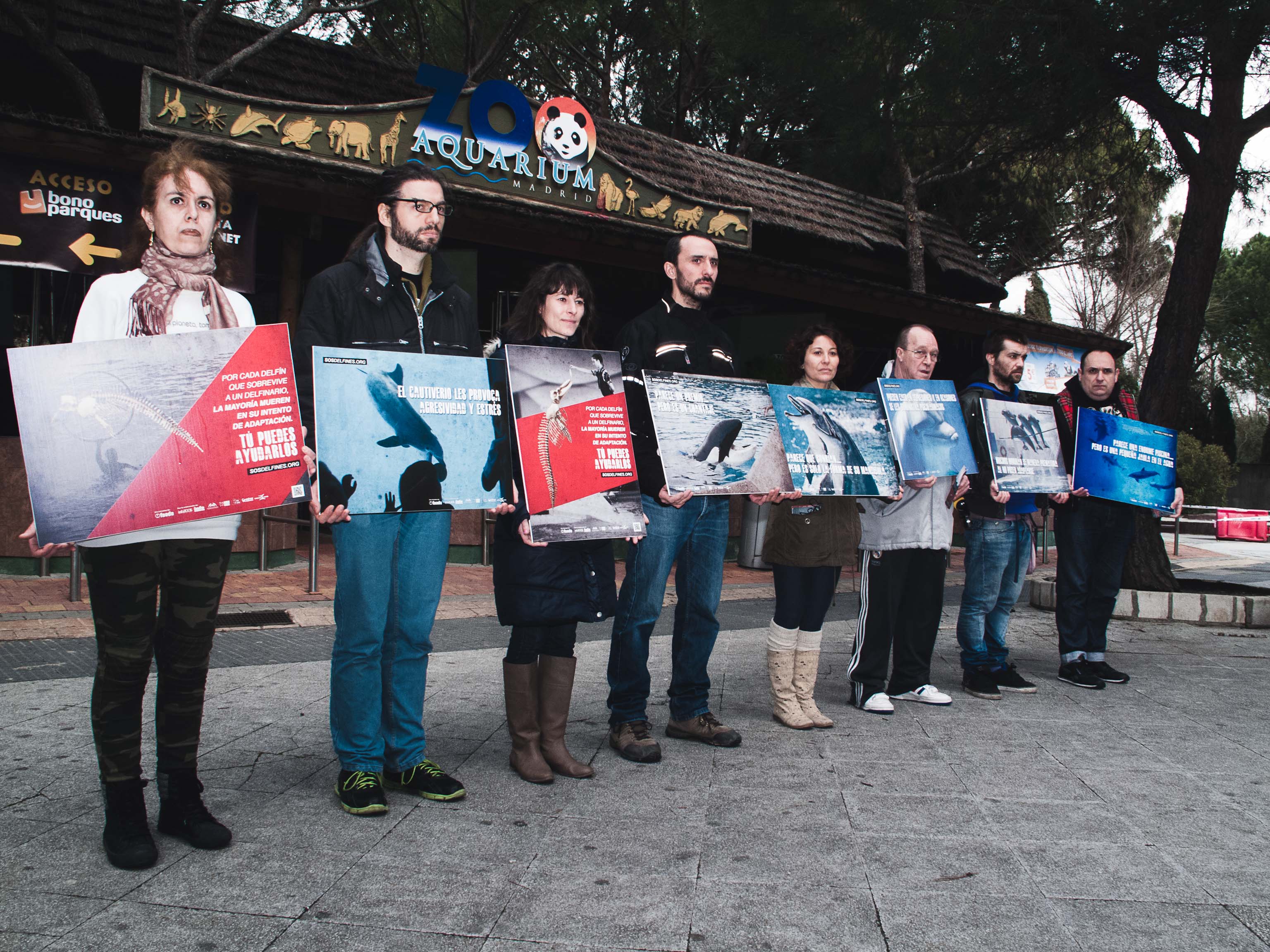 Madrid, 10 de marzo 2013. - Activistas convocados por la coalición SOSdelfines informaron este domingo a los visitantes del zoológico de Madrid sobre el sufrimiento que padecen estos animales en cautividad.