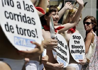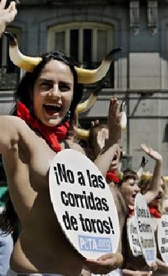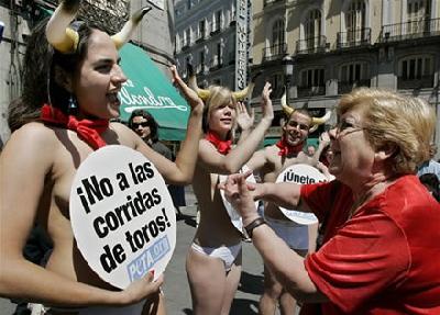 La protesta se realizó en la Puerta del Sol, tradicional lugar español, y en ella participaron una docena de activistas semidesnudos que gritaron consignas en contra de la festividad de San Fermín.