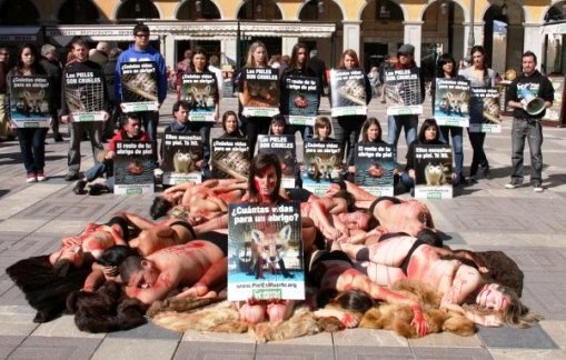 El resto de activistas portaban carteles con imagenes que mostraban la cara cruel y oculta de un negocio que cada año quita la vida a mas de 60 millones de animales por una cuestión meramente estética.
