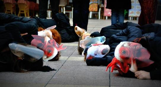 El performance que consistía en varias personas vestidas de negro, tumbadas/os en el suelo y con caretas de animales, pretendía mostrar las víctimas que mueren cada día en los mataderos. Mientras, otras/os se dedicaban a repartir folletos y a informar sobre las alternativas, una alimentación 100% vegetal, totalmente sana y equilibrada y que además es mucho más respetuosa con el medio ambiente.