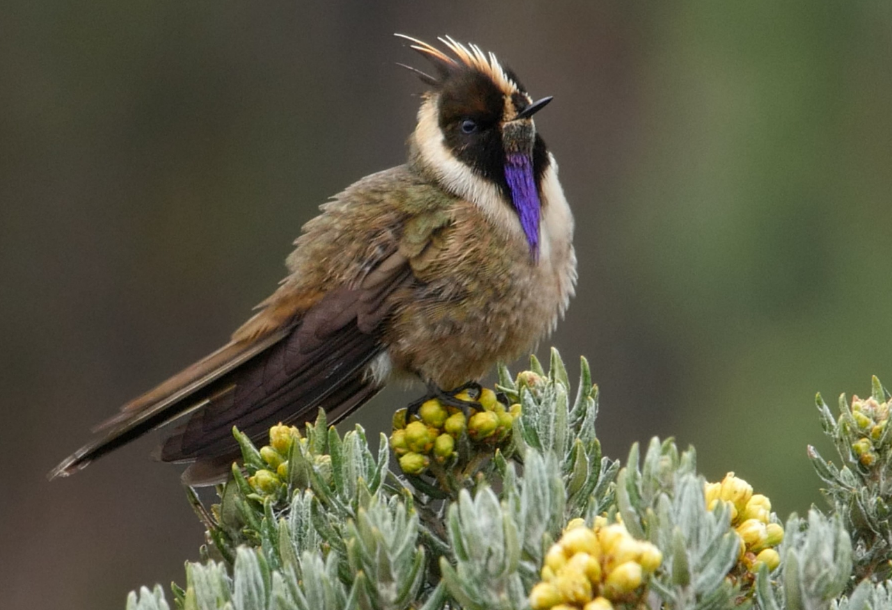 Tiene un tamaño entre los 11 y los 12 cm y un pico de 1.5 cm de largo. Una cresta de color canela con negro, una mancha oscura triangular en los dos lados de la cara alrededor de sus ojos. Su barba es canela con verde y en el centro predomina un tono púrpura para los machos. Las hembras mantienen los colores oscuros.