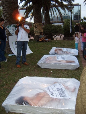 Tres activistas de AnimaNaturalis decidieron bajo la consigna “A ninguno de nosotros nos gustaría terminar así, a los demás animales tampoco” desnudarse, cubrirse con plástico, y recostarse por alrededor de 45 minutos en bandejas que simulaban las que se encuentran en los supermercados para vender la carne.