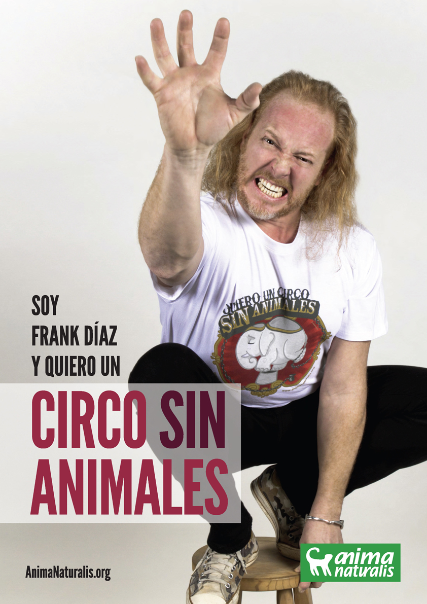 Ahora, Frank Díaz se convierte también en la imagen central de la nueva campaña de AnimaNaturalis para denunciar el maltrato y la crueldad que se oculta detrás de la explotación de los animales en los circos. "Viví dentro de un circo durante una temporada larga en gira por toda España, y lo más duro era ver cómo maltrataban a los animales", declara Frank Díaz mientras explica cómo vivió su paso por un circo con animales. Según relata, él mismo presenciaba cada día la crueldad a la que se les somete, "al ser obligados a vivir en jaulas muy pequeñas durante muchos meses seguidos".