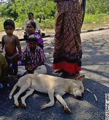 Como la mayoría de la gente ha oído, en general, los animales pasaron relativamente bien del impacto inicial y son las consecuencias las que preocupan. Los voluntarios locales han hecho las observaciones de los animales, mientras que participan en otros esfuerzos de ayuda en el sur y el este. llevando alimentando a los perros.Tenemos observación de primera mano de algunas áreas de muchos animales desesperados para el alimento y el agua - los perros luchaban por el alimento , y algunos bebían el agua de mar, que estaba dando por resultado una espuma en la boca y debemos tener cuidado de aplacar cualquier rumor que esto es de rabia. Se espera que las organizaciones internacionales de ayuda consigan alimento y el agua para las personas, los efectos se filtrarán a los animales también, pues no tenemos recursos humanos ahora para una campaña de alimentación de extensión amplia.