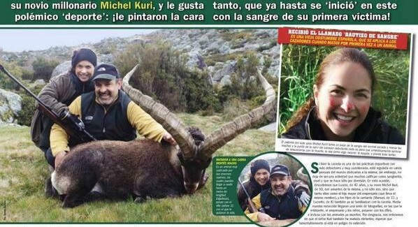 La publicación de una conocida revista muestra a Lucero sonriendo sobre el cadáver de un animal muerto junto a su novio, un millonario que desde joven gusta de matar animales por diversión y tenerlos en casa como trofeo.