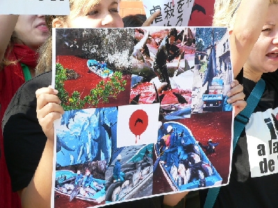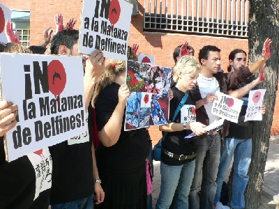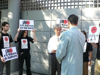 Activistas de AnimaNaturalis en Madrid se manifestaron frente a la embajada de Japón para protestar contra la matanza de delfines en este país. Se contó con la participación de alumnos del Instituto Ramiro de Maeztu.