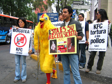 Activistas de PETA y AnimaNaturalis se concentraron frente al KFC ubicado en Insurgentes junto al WTC de la Ciudad de México para protestar contra los abusos que la transnacional comete con los pollos.