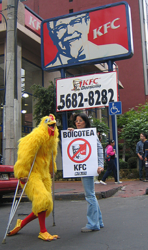Un pollo gigante cruzó varias veces la avenida mientras activistas sujetaban pancartas describiendo las prácticas habituales de la industria del pollo, y repartían folletos sobre el boicot a KFC.