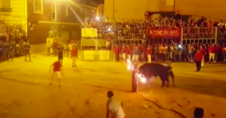 El rito del toro embolao consiste en colocar dos bolas de alquitrán prendidas en los cuernos del animal y esquivar sus embestidas de impotencia y angustia entre las llamas. Pero el toro de Foios no tuvo la ocasión de embestir a nadie: confundido, giró sobre sí mismo y terminó por estrellarse él solo.