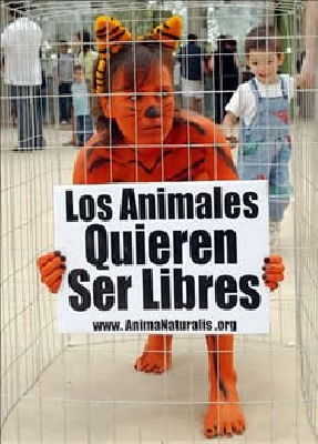 La joven pertenece a la asociación AnimaNaturalis, que defiende los derechos de los animales, y junto a otros compañeros ha exhibido pancartas con el lema "Los animales quieren ser libres" y ha repartido folletos entre las personas que se dirigían al Zoo.