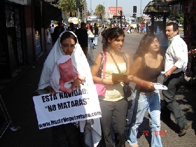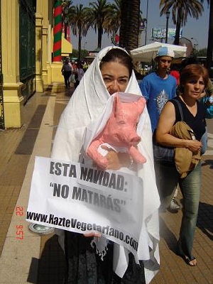 Con el objetivo de promover una Navidad más compasiva con los animales no-humanos, Rosita Saavedra se vistió de Virgen María y caminó varias cuadras de la principal avenida de Santiago con un chanchito en brazos. La activista de AnimaNaturalis fue acompañada por otros miembros de la agrupación que entregaron volantes y conversaron con los transeúntes, en el marco de la campaña Esta Navidad: “No Matarás”.